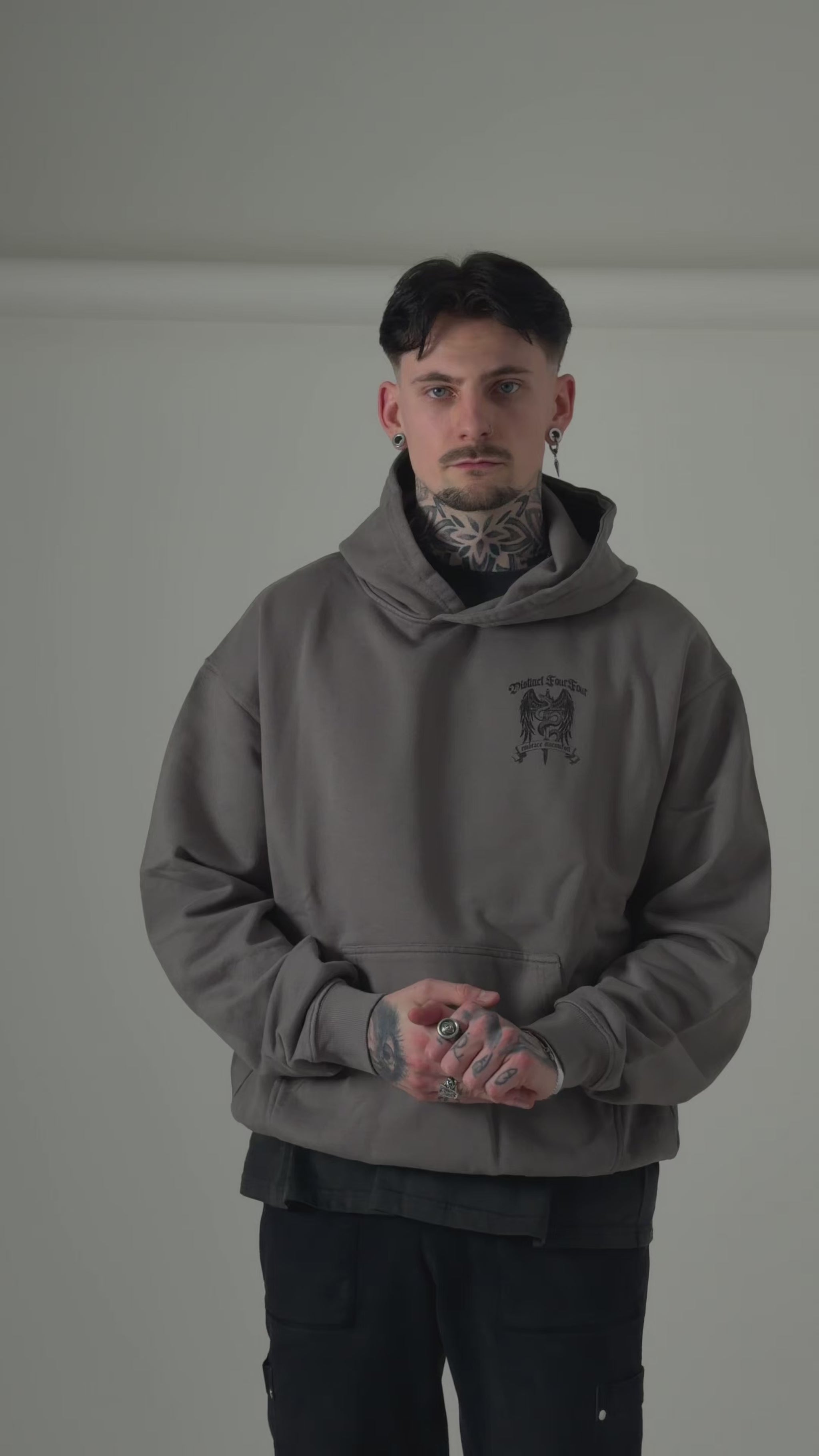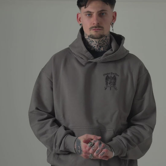 Long Sleeve Pigment Grey Hoodie with an oversized fit and crafted from heavyweight cotton. The Hoodie features ribbed hems and cuffs and is finished with our Embrace Discomfort graphic to the left chest and back.