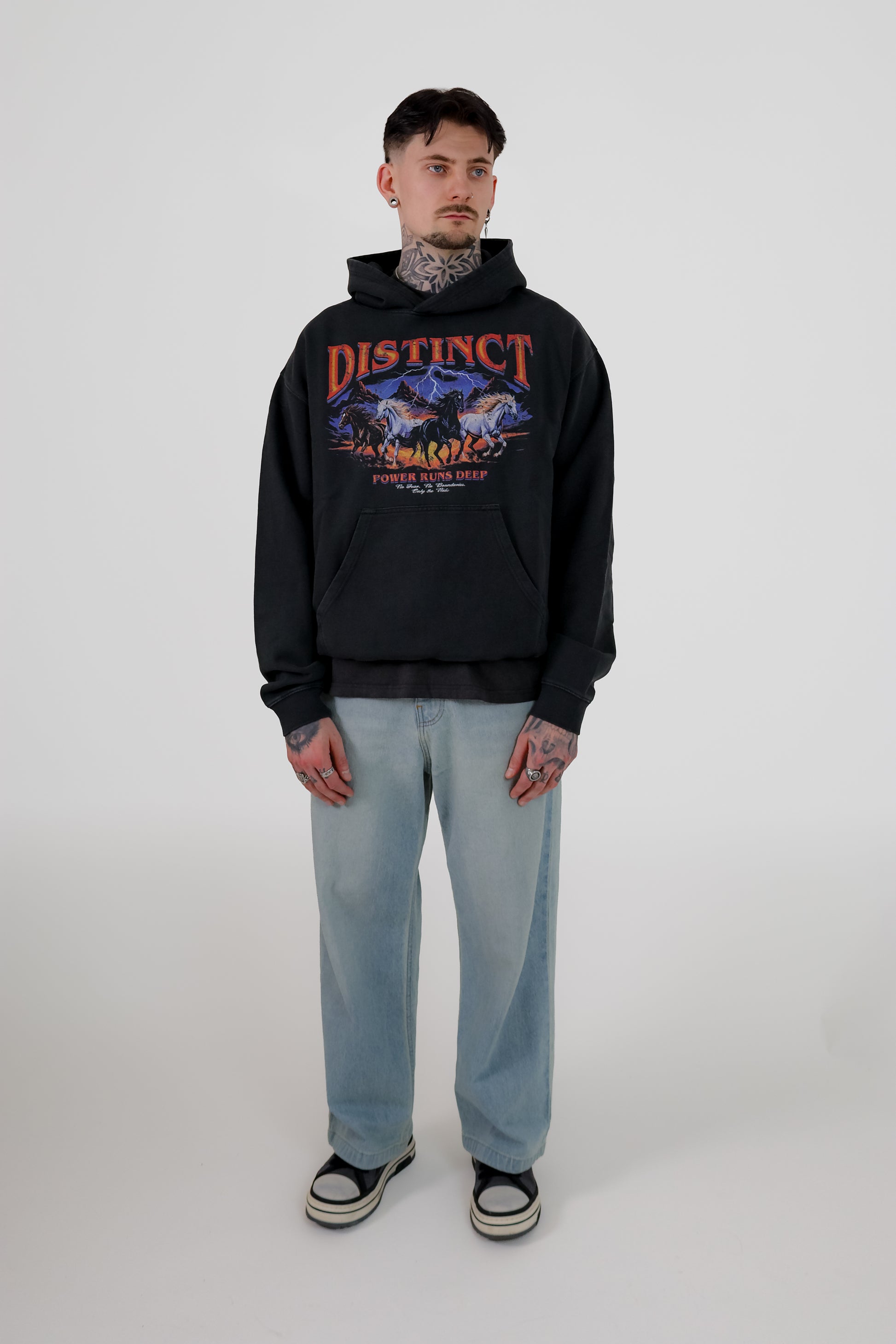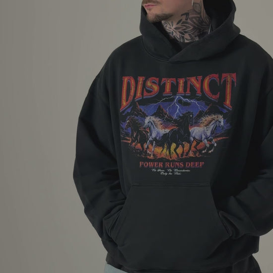 Long Sleeve Vintage Black Hoodie with an oversized fit and crafted from heavyweight cotton. The Hoodie features ribbed hems and cuffs and is finished with our Power runs deep graphic to the front - four wild horses charging through a storm, symbolising strength and fearlessness.